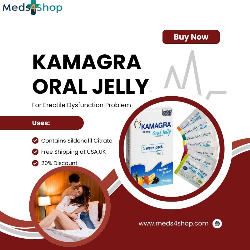 Buy Kamagra Oral Jelly   is a popular and fast-acting solution for men experiencing erectile difficulties. It contains Sildenafil Citrate, a powerful PDE5 inhibitor that helps increase blood flow to the penile area, enabling a firm and lasting erection during intimacy. Unlike traditional pills, Kamagra Oral Jelly comes in easy-to-consume flavored sachets that work within minutes. For safe use, take it only once a day and avoid alcohol or heavy meals before consumption. Always follow your doctor’s guidance to prevent side effects. Shop genuine Kamagra Oral Jelly conveniently and discreetly from Meds4Shop , your trusted online pharmacy for quality ED medications.